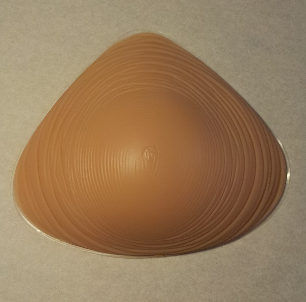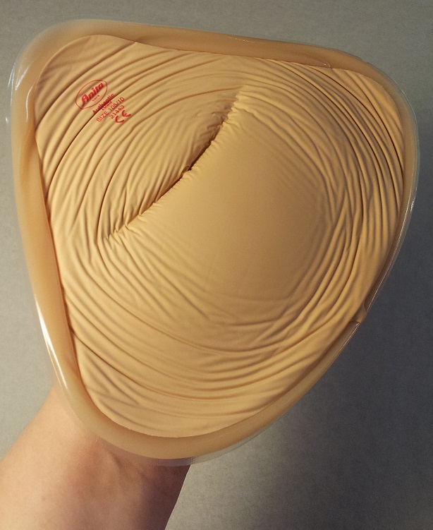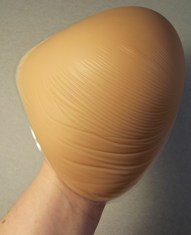 Proteesi on mallia ”Authentic”. Alussa se nauratti, mutta on tämä kyllä aika autenttinen. Nyt kun hartiasärky ei enää ilmianna tissinpuutetta vähän väliä, niin sen huomaa ainoastaan silloin kun kumitissi aavemaisesti koskettaa jotain ja huomaan ettei rinnan päällä ole minkäänlaista tuntoa. Vähänkuin tunnottomaksi puutuneella raajalla koskettelu, se tuntuu vieraalta koska siitä puuttuu tunto, mutta on silti oma. Silikoni lämpiää vartalon kanssa tasan samaan lämpötilaankin niin nopeasti että proteesi lakkaa tuntumasta eikä illuusio säry jollen töki rintaa jatkuvasti. Proteesin sisäpuoli on todella pehmeä ja hyvin muokkautuva ja myötäilee rintakehääni hyvin. Syöpäyhdistyksen hoitajan mukaan tässä proteesissa pitäisi olla sellainen oikeaa rintaa matkiva ominaisuus, että kun menen makaamaan selälleni, proteesi ”lässähtää” samaan tapaan kuin oikeakin rinta, eikä jää terhakkana töröttämään pystyyn. Tämä mekanismi näkyy sisäpuolella eräänlaisena vekkinä, taitoksena, joka näkyy parhaiten viimeisessä kuvassa.