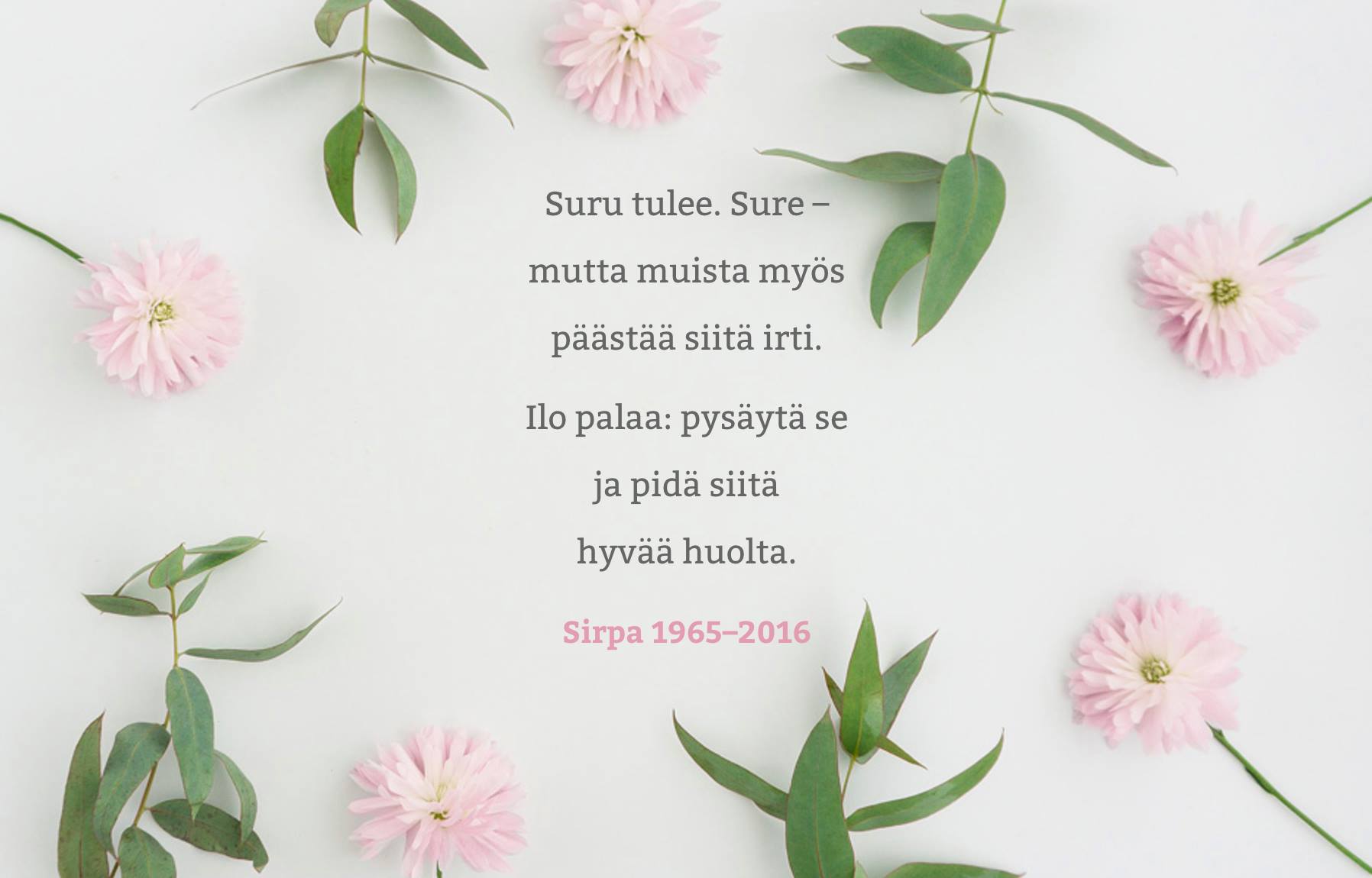 Suruviesti tavoitti. Hyvää matkaa Tiina, lohdullista oli kuulla että selvisit loppuun asti hyvin, ilman pahempia kipuja. Olit yksi niistä kroonikoista jotka jaksoivat olla loputtoman positiivisia ja aktiivisia, mikä on huikeaa kun sairastit jo vuodesta 2008 alkaen, etkä vain yhtä syöpää.